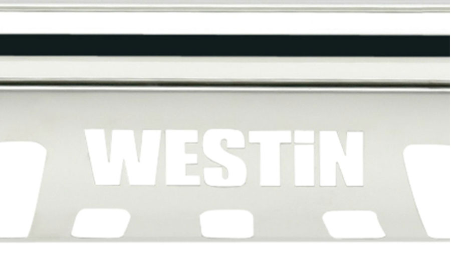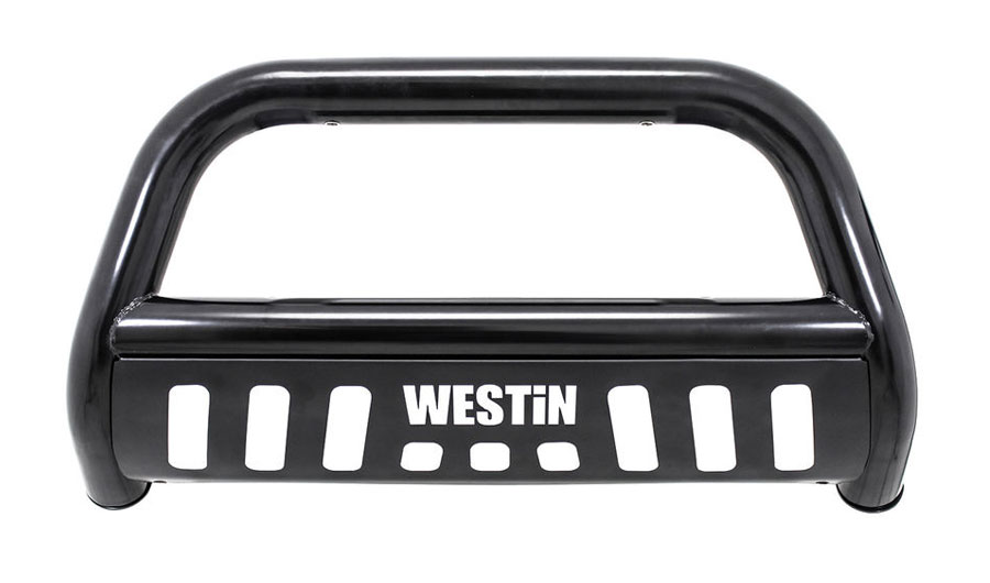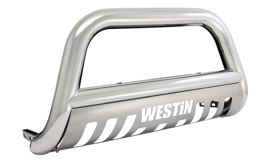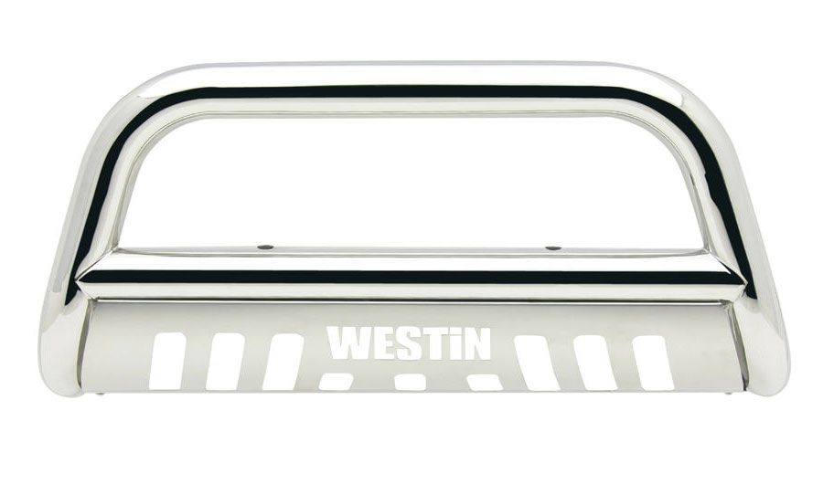 Westin’s E-Series Bull Bars are front-end light bars designed for trucks and larger model SUVs. Our bull bars mount to the vehicle’s existing mounting points and no drilling is required for installation. It also features mounting points for 2 auxiliary lights up to 6 inches in diameter. Available in polished stainless steel with a brushed skid plate or black powder coated e-coated steel with a textured black skid plate. Optional license plate bracket is available. Includes vehicle specific mount kit.